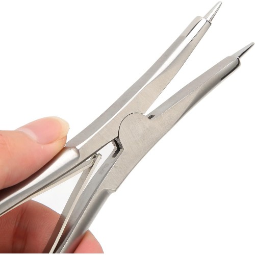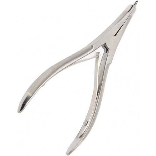 Stainless steel pliers designed for expanding acoustic tubing before fitting on hearing aid ear hooks.